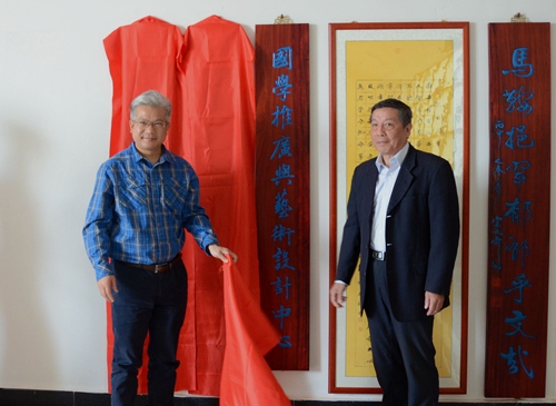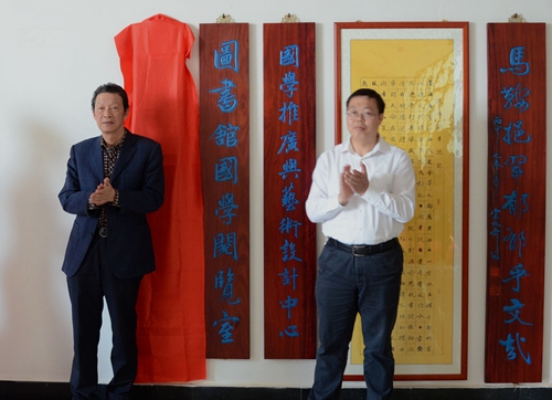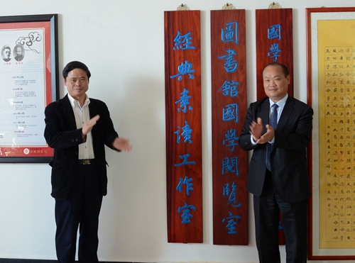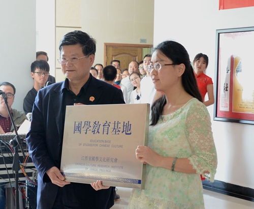 曾萍和万明共同为孔目湖书院揭牌,其他嘉宾分别为国学推广与艺术设计中心、图书馆国学阅览室、经典素读工作室揭牌,尹建维代表恩悦书院赠孔目湖书院印章,省国学文化研究会为书院授予国学教育基地牌匾。