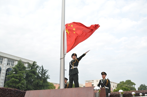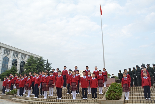 千余名师生按方阵排列整齐有序。国旗护卫队迈着矫健的步伐,护送国旗走向升旗台。伴随激昂的国歌,五星红旗迎着初升的朝阳冉冉升起。全体人员高唱国歌,向国旗行注目礼。