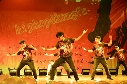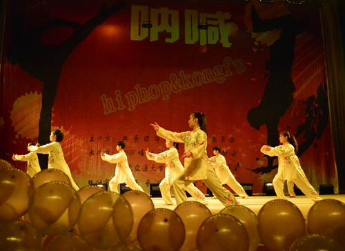 我校NSF嘻哈社带来的《精武霍元甲》出拳踢腿刚劲有力,呐喊声慷慨激昂,全场热血沸腾。《舞加舞》节目亦是热情四射,舞者配合默契,舞蹈动感。我校武术协会的武术串烧《魂》更是上演了一场行云流水的太极以及刀、枪、棍的表演,展现出中华武术刚柔并济之精华。刀枪对打、鞭声呼啸,精彩纷呈,引来一片叫好之声,现场气氛一度升温。