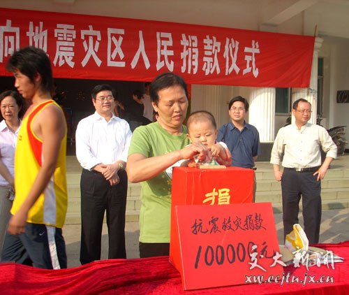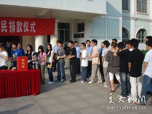 捐款仪式上,理工学院(黄家湖)师生的捐款热情让所有人感动。“虽然我们捐的钱是有限的,但是对灾区同胞的关心之情是无限的。”一名男生说道,“四川发生灾害不是一个人、一个家庭的事,而是我们大家的事情!我们相信,只要大家团结一心,众志成城,一切都会好起来的。”