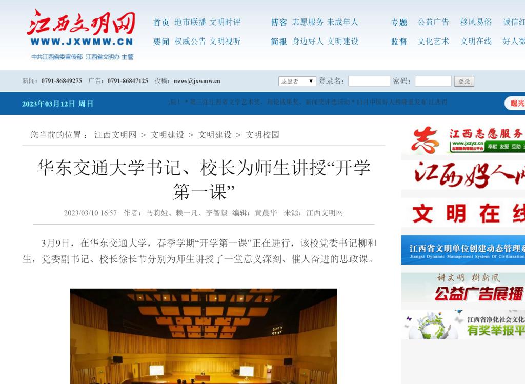3月9日,在华东交通大学,春季学期“开学第一课”正在进行,该校党委书记柳和生,党委副书记、校长徐长节分别为师生讲授了一堂意义深刻、催人奋进的思政课。
