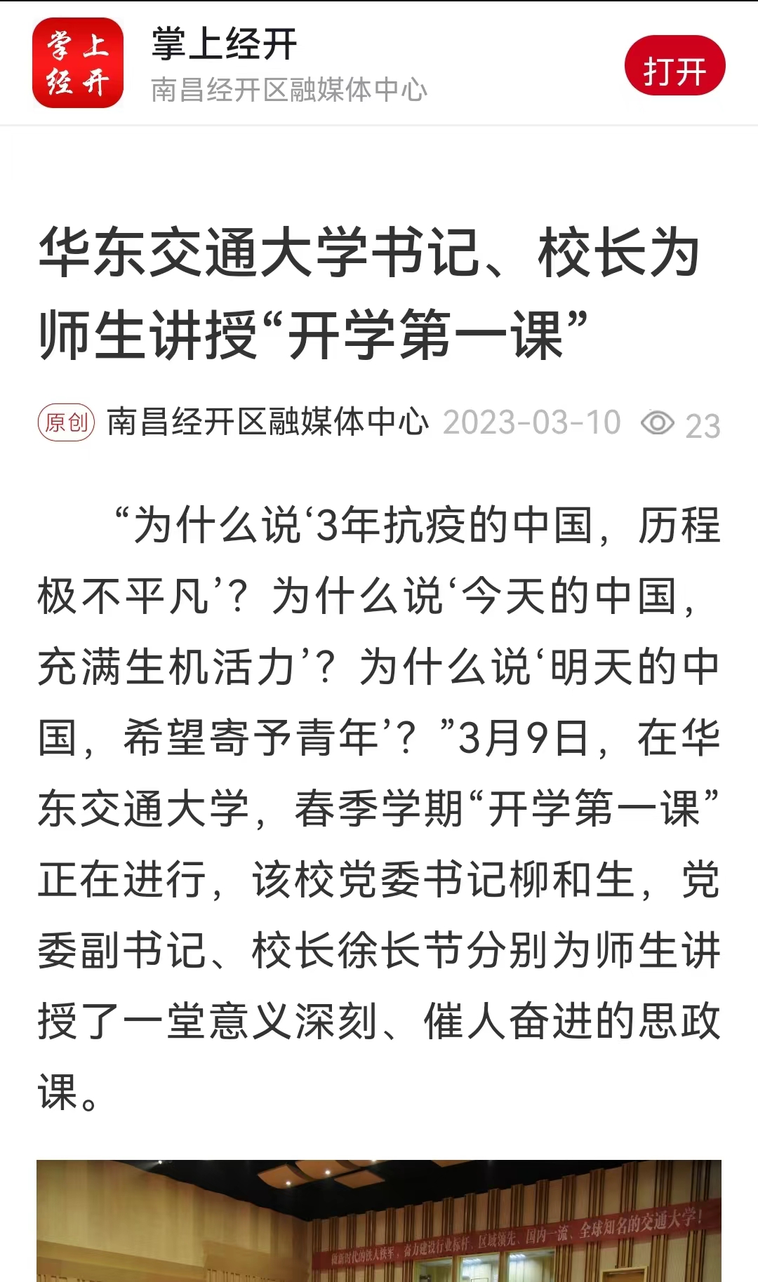 “为什么说‘3年抗疫的中国,历程极不平凡’?为什么说‘今天的中国,充满生机活力’?为什么说‘明天的中国,希望寄予青年’?”3月9日,在华东交通大学,春季学期“开学第一课”正在进行,该校党委书记柳和生,党委副书记、校长徐长节分别为师生讲授了一堂意义深刻、催人奋进的思政课。