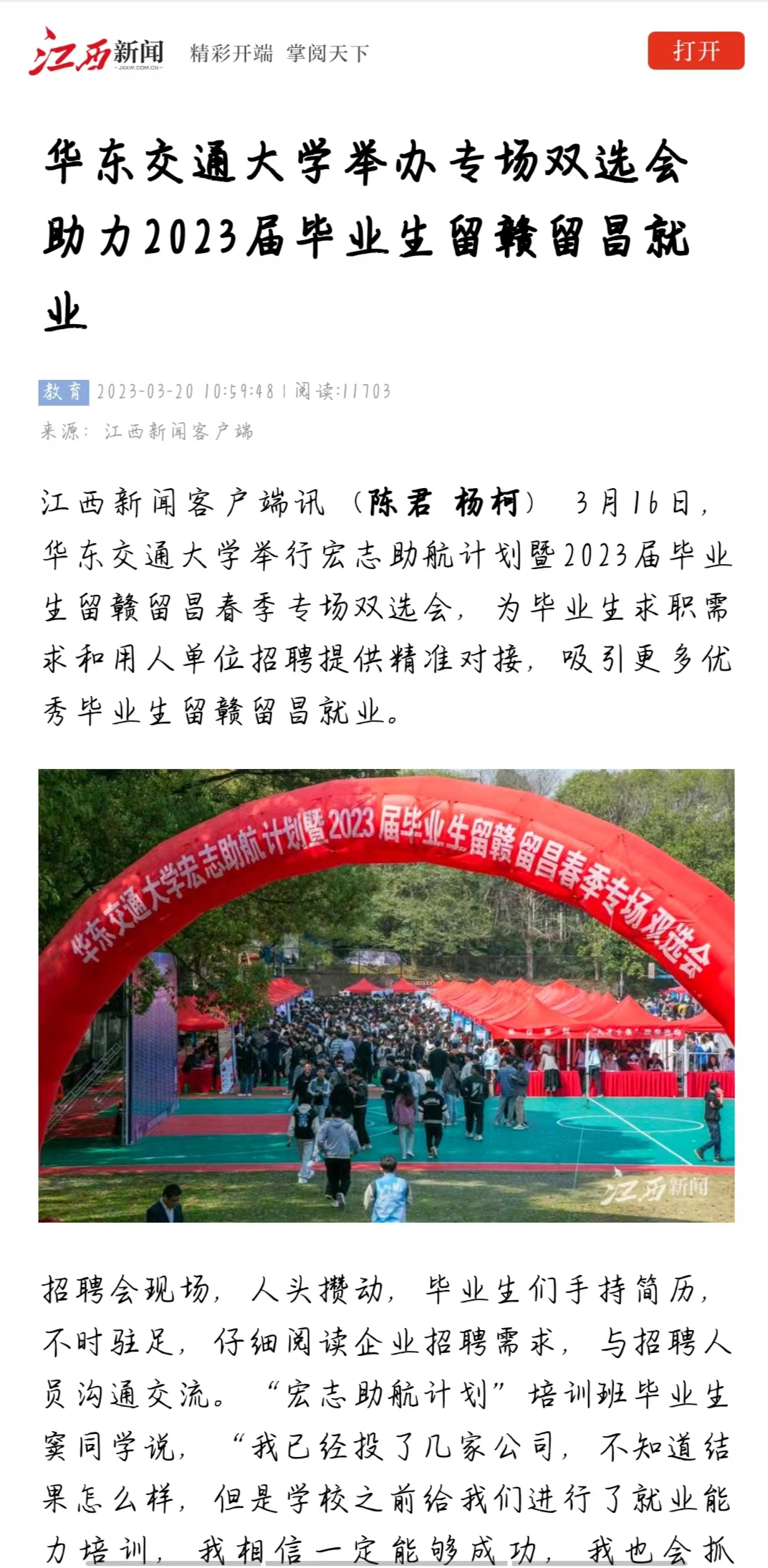接下来,华东交通大学将以就业创业指导服务月活动、江西省大学生职业规划大赛作为契机,积极宣传江西就业创业政策,分批组织师生赴在赣在昌企业实地参观交流,增强毕业生留赣留昌就业信心,并在线上开设“爱上江西”“服务江西”专栏,增强学生对红土圣地的感情,引导该校学子在江西、干在江西,自主创业、扎根基层。同时,华东交通大学近3年本科生留赣就业比例稳定在35%左右。