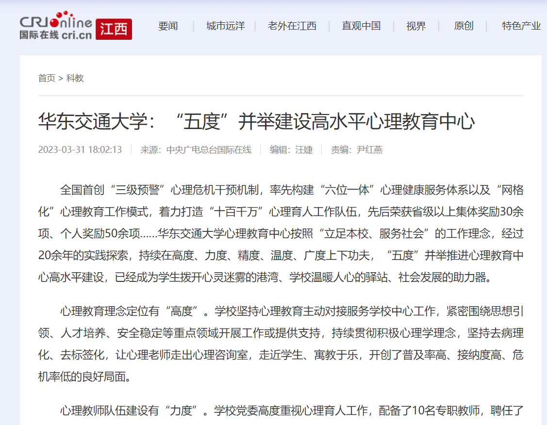全国首创“三级预警”心理危机干预机制,率先构建“六位一体”心理健康服务体系以及“网格化”心理教育工作模式,着力打造“十百千万”心理育人工作队伍,先后荣获省级以上集体奖励30余项、个人奖励50余项……华东交通大学心理教育中心按照“立足本校、服务社会”的工作理念,经过20余年的实践探索,持续在高度、力度、精度、温度、广度上下功夫,“五度”并举推进心理教育中心高水平建设,已经成为学生拨开心灵迷雾的港湾、学校温暖人心的驿站、社会发展的助力器。