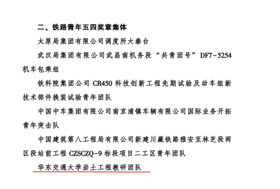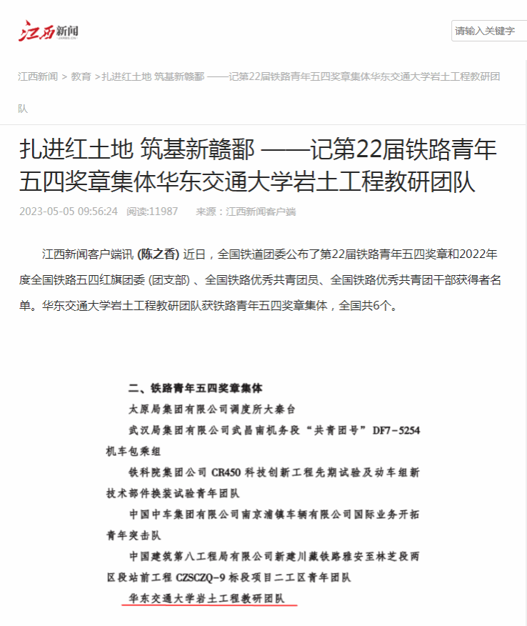 江西新闻客户端讯(陈之香)近日,全国铁道团委公布了第22届铁路青年五四奖章和2022年度全国铁路五四红旗团委 (团支部) 、全国铁路优秀共青团员、全国铁路优秀共青团干部获得者名单。华东交通大学岩土工程教研团队获铁路青年五四奖章集体,全国共6个,教育系统唯一。