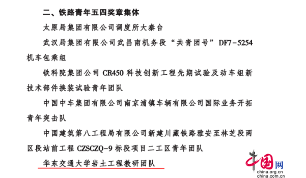 中国网讯 近日,全国铁道团委公布了第22届铁路青年五四奖章和2022年度全国铁路五四红旗团委 (团支部)、全国铁路优秀共青团员、全国铁路优秀共青团干部获得者名单。华东交通大学岩土工程教研团队获铁路青年五四奖章集体,全国共6个,教育系统唯一。