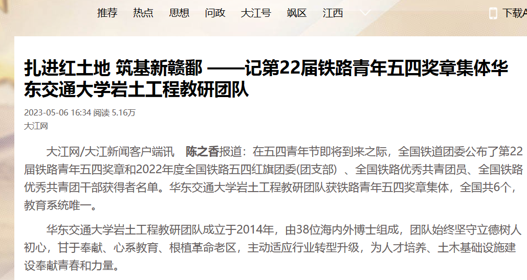 大江网/大江新闻客户端讯陈之香报道:在五四青年节即将到来之际,全国铁道团委公布了第22届铁路青年五四奖章和2022年度全国铁路五四红旗团委(团支部) 、全国铁路优秀共青团员、全国铁路优秀共青团干部获得者名单。华东交通大学岩土工程教研团队获铁路青年五四奖章集体,全国共6个,教育系统唯一。
