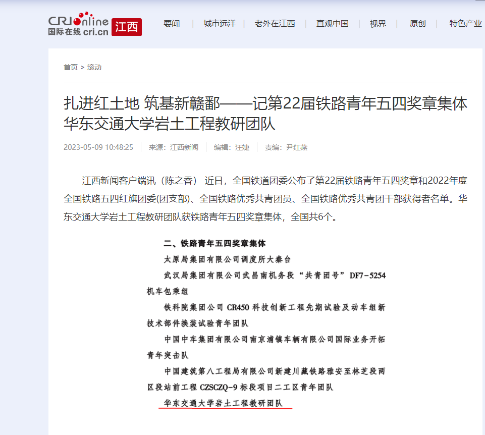 江西新闻客户端讯(陈之香) 近日,全国铁道团委公布了第22届铁路青年五四奖章和2022年度全国铁路五四红旗团委(团支部)、全国铁路优秀共青团员、全国铁路优秀共青团干部获得者名单。华东交通大学岩土工程教研团队获铁路青年五四奖章集体,全国共6个。