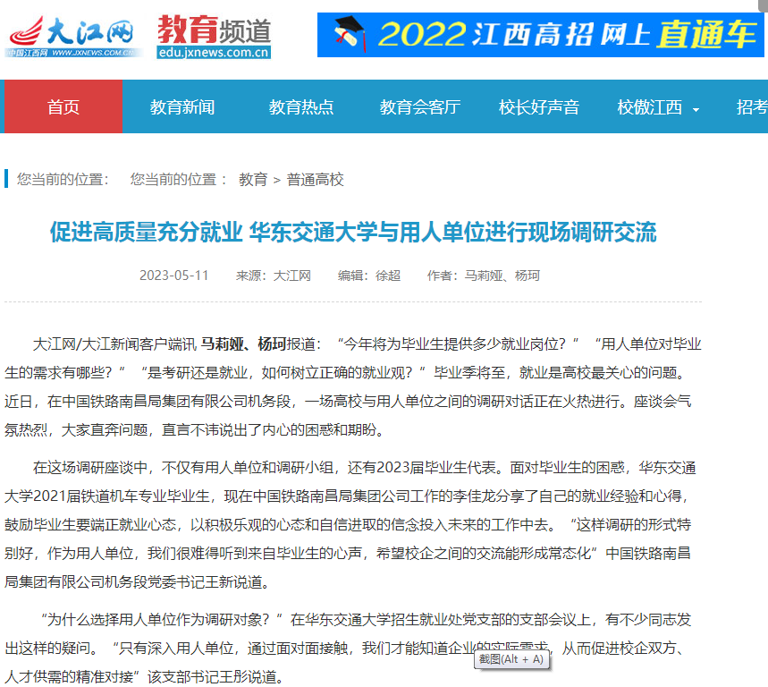 在与中国铁路南昌局集团有限公司车辆段、中国铁路呼和浩特集团有限公司等用人单位的座谈中,校企双方共同探讨了毕业生“慢就业、不就业”、用人单位“招聘需求与实际情况不匹配”等“问题清单”。调研组认真听取用人单位对学校就业工作及人才培养的建议,希望双方充分发挥各自优势,在产教融合、学生联合培养、毕业生就业创业等方面开展深度合作。调研中,校企双方达成共识,纷纷表示要坚持问题导向,为拓宽就业渠道提出新思路和新办法,切实为学生提供指导服务,提升就业育人质量。