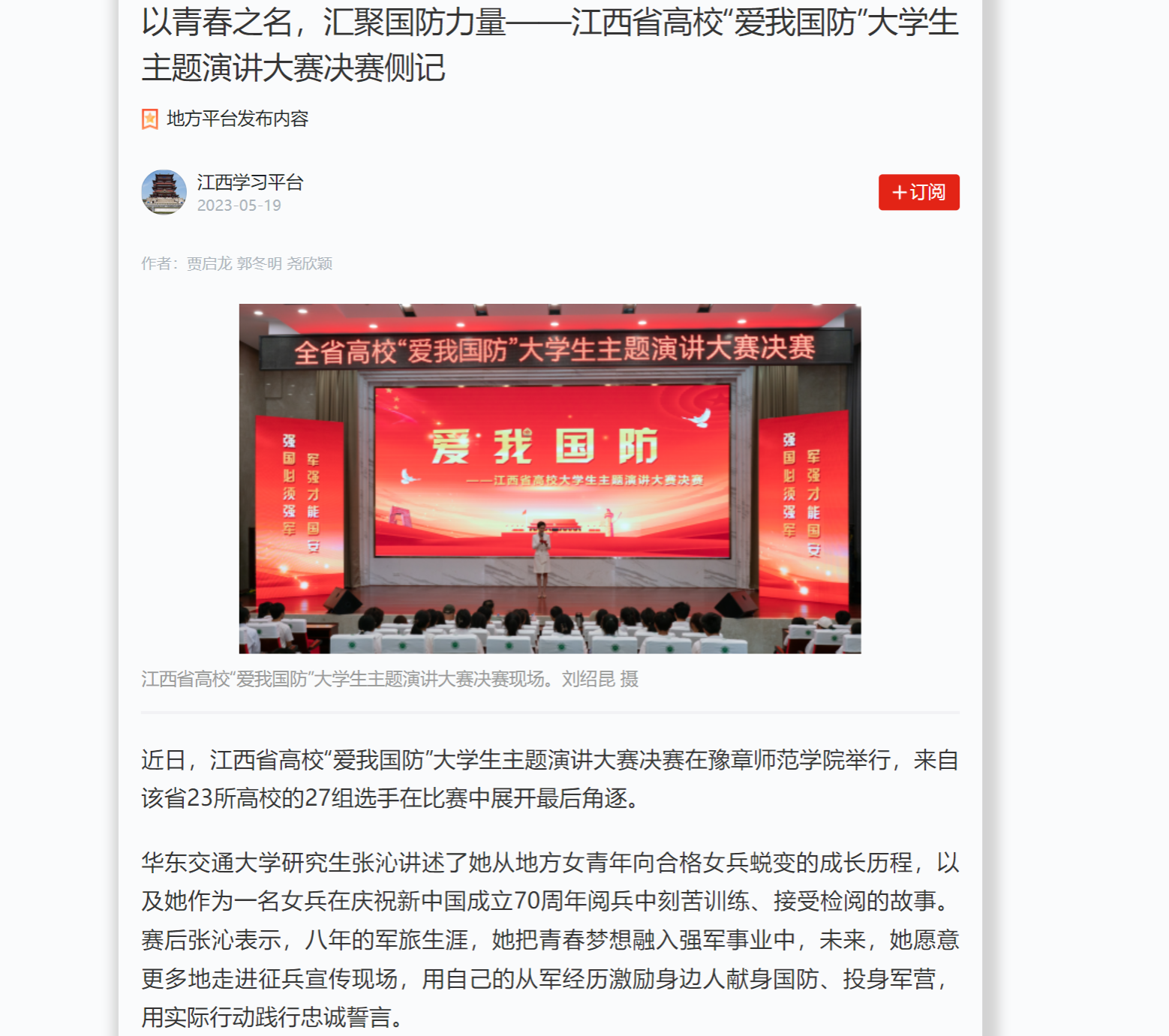 近日,江西省高校“爱我国防”大学生主题演讲大赛决赛在豫章师范学院举行,来自该省23所高校的27组选手在比赛中展开最后角逐。