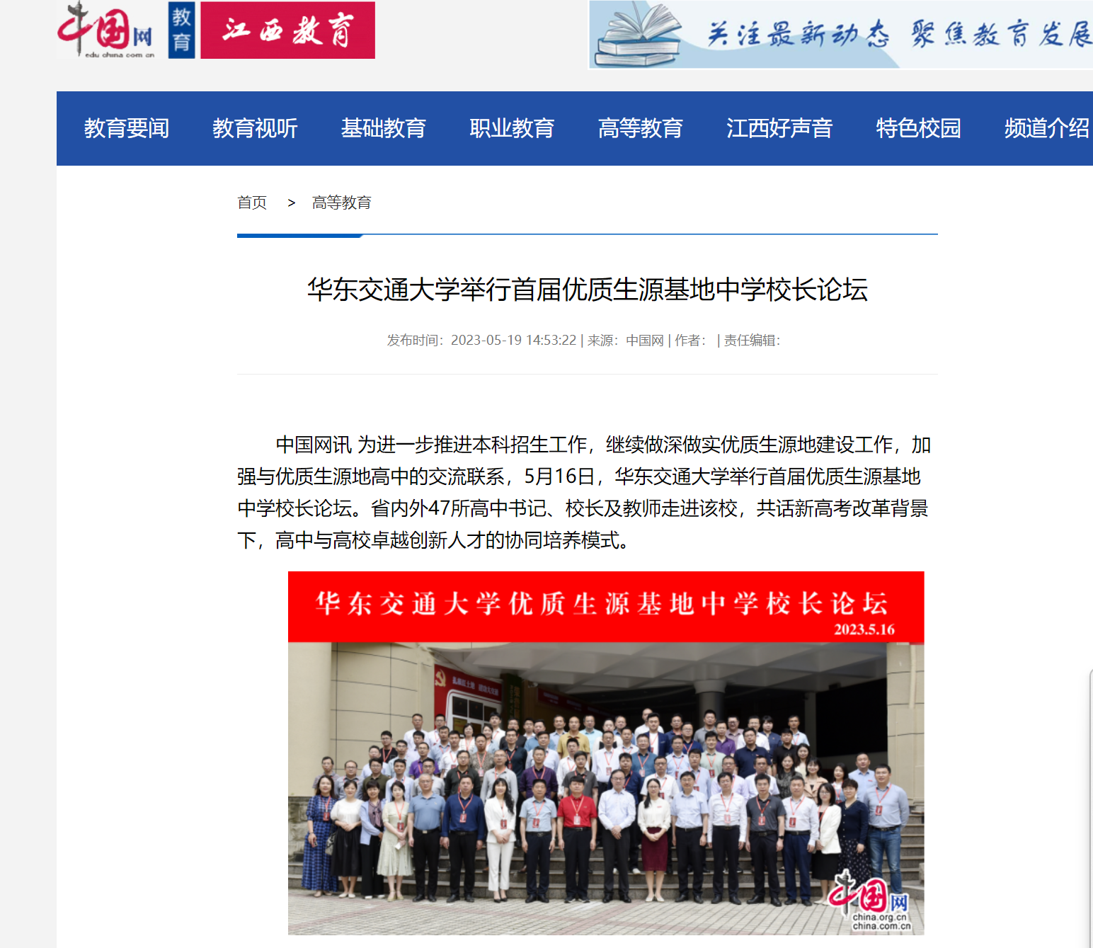 中国网讯 为进一步推进本科招生工作,继续做深做实优质生源地建设工作,加强与优质生源地高中的交流联系,5月16日,华东交通大学举行首届优质生源基地中学校长论坛。省内外47所高中书记、校长及教师走进该校,共话新高考改革背景下,高中与高校卓越创新人才的协同培养模式。
