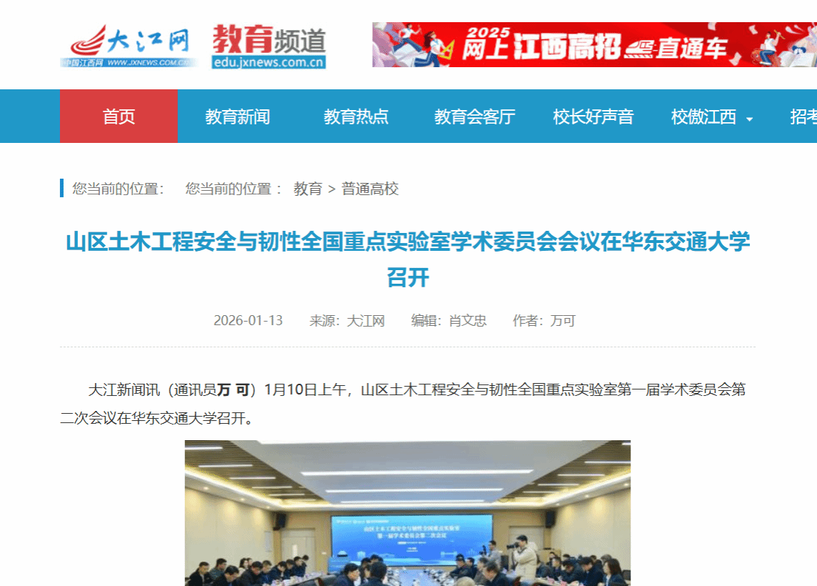 大江新闻讯(通讯员万可)1月10日上午,山区土木工程安全与韧性全国重点实验室第一届学术委员会第二次会议在华东交通大学召开。