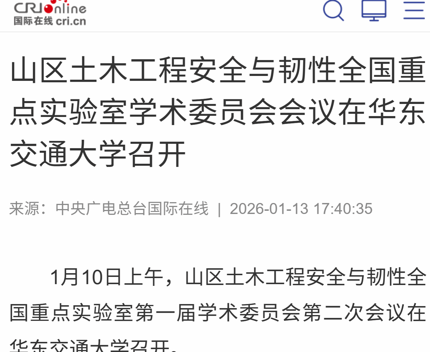 1月10日上午,山区土木工程安全与韧性全国重点实验室第一届学术委员会第二次会议在华东交通大学召开。