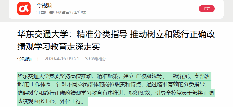 华东交通大学党委坚持高位推动、精准施策,建立了“校级统筹、二级落实、支部落地”的工作体系,针对不同党员群体的岗位职责和特点,通过精准有效的分类指导,确保树立和践行正确政绩观学习教育有序推进、取得实效,引导全校党员干部将正确政绩观内化于心、外化于行。